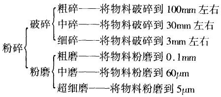 將固體物料破碎的力法有多種,通常采用機械方法,如顎式破碎機、反擊式破碎機、第三代制砂機等,物料的破碎作業(yè)一般是在破碎機和粉磨機內(nèi)進行的,所以按物料破碎的粗細程度,又劃分為破碎和粉磨兩個過程,如下圖: